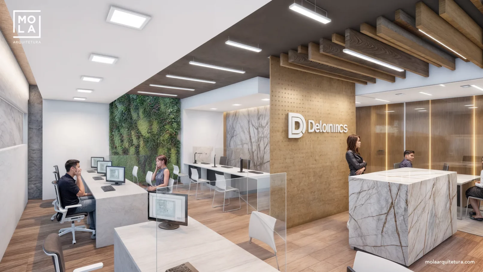 O projeto buscou, a partir desta solicitação, o uso de materiais leves, a organização fluída dos ambientes e estações de trabalho, além da iluminação difusa e abundante na área de atendimento.