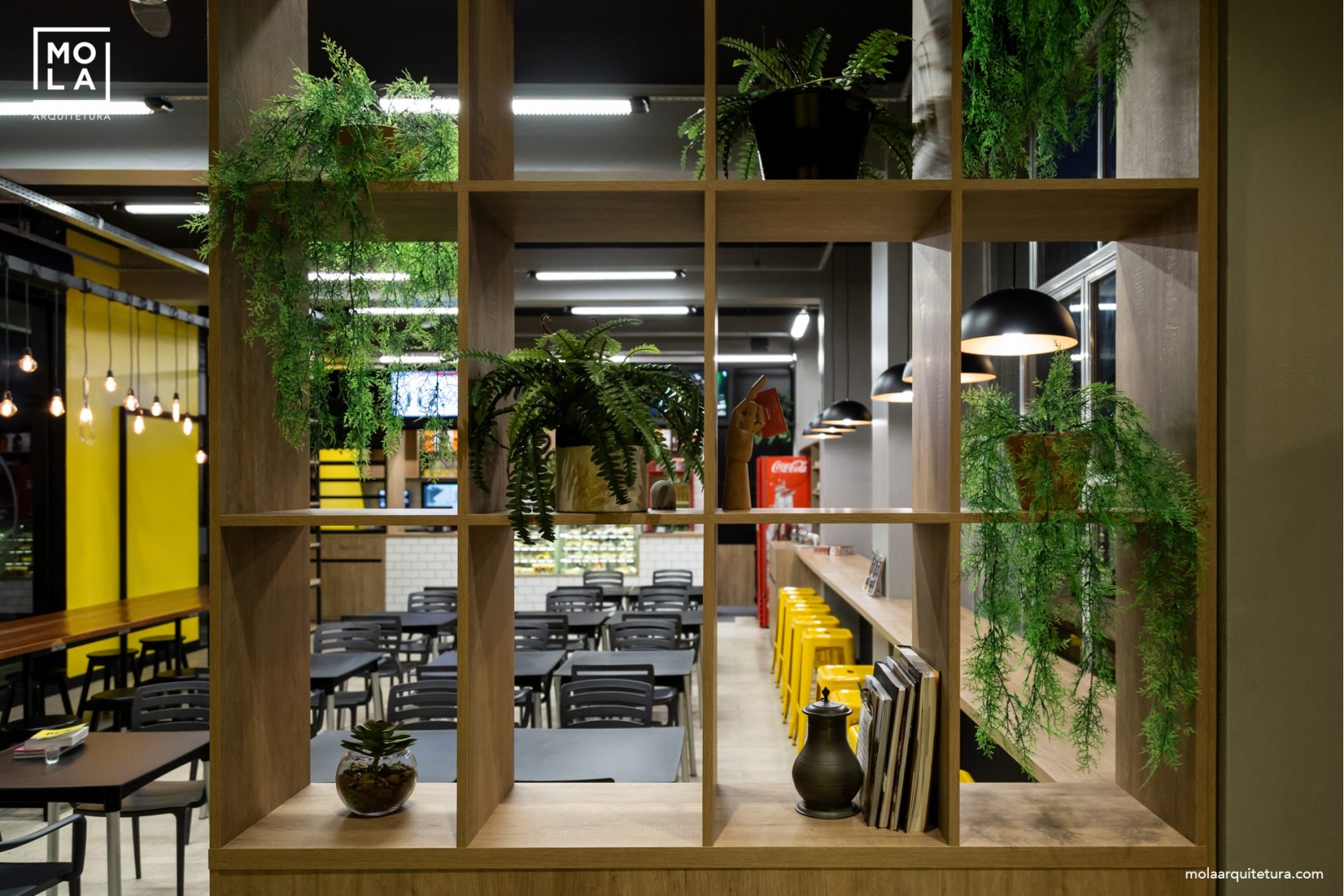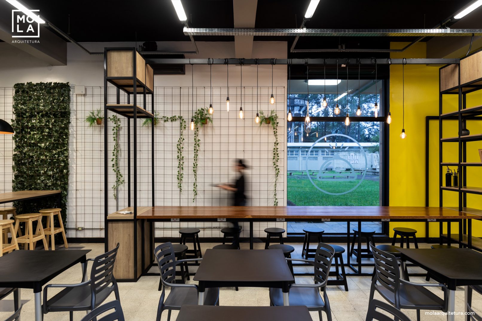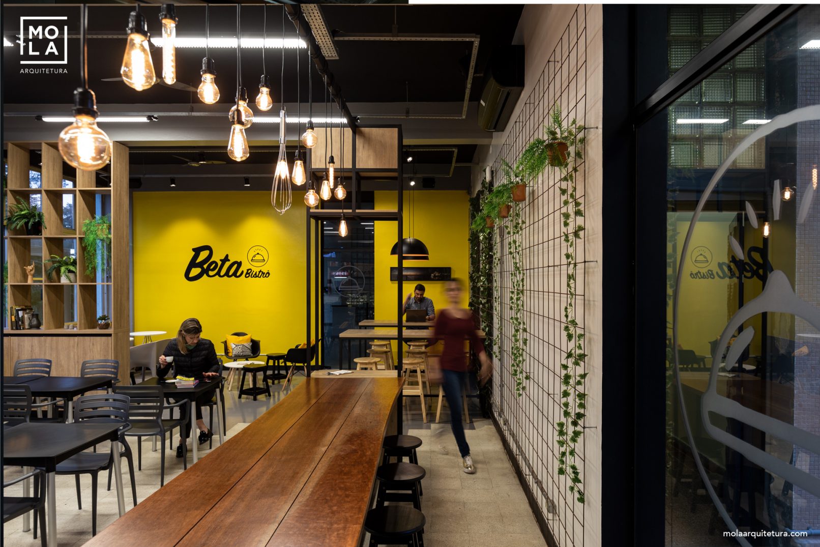 Neste projeto do BETA Bistrô se priorizou a criação de espaços de socialização e de um layout que atendesse a todas as necessidades, café, bistrô, gastronomia, cursos eventos e ate lugar de trabalho. Para manter uma escala íntima, algumas lâmpadas foram distribuídas em diferentes alturas, suspensas em quase toda a área do restaurante, esses elementos com as árvores permitem que os usuários se sintam em uma área espaçosa, mas protegida