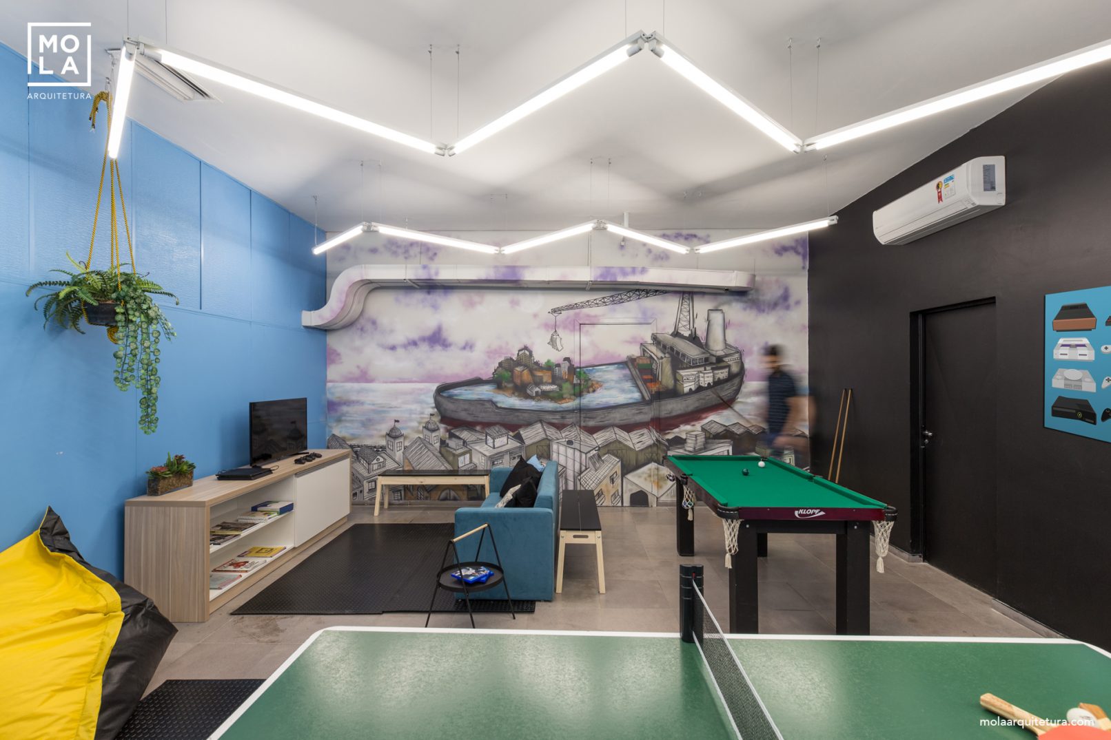 Para trazer mais luz e movimento para um ambiente caracterizado pela linearidade e escassez de iluminação natural, criou-se um jogo em zigue-zague com as luminárias, tornando a iluminação um dos elementos de destaque do projeto. Além disso, as cores e elementos decorativos do espaço foram pensados de maneira a qualificar e enfatizar este espaço como área de descompressão entre os horários de trabalho.
