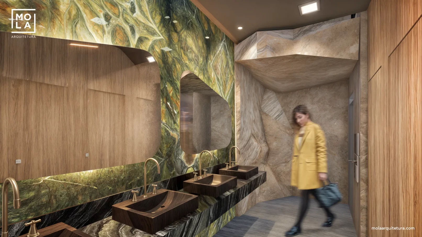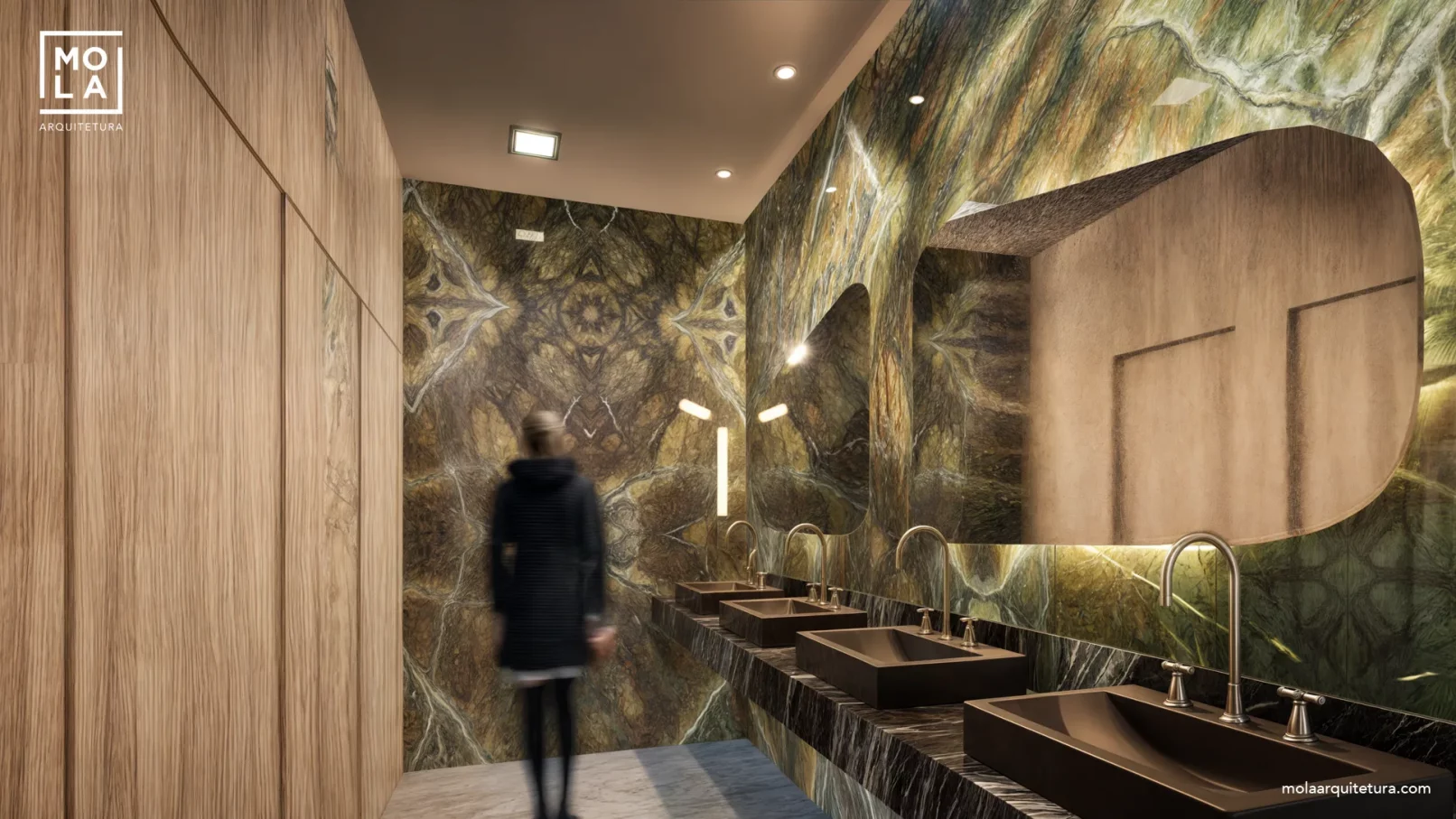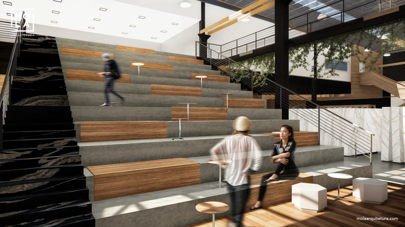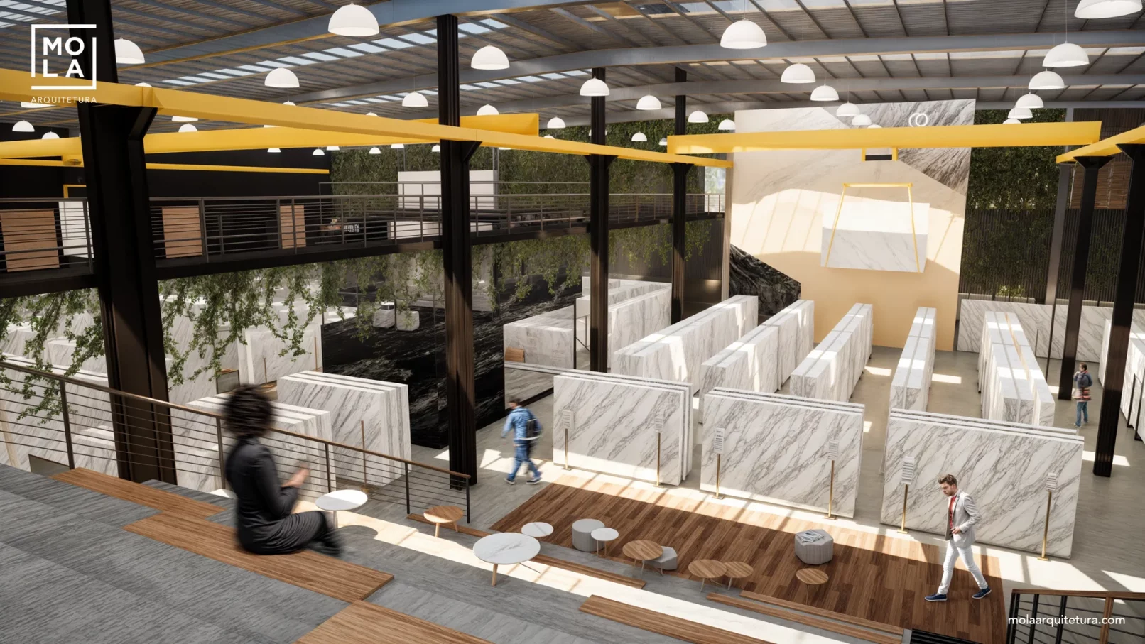 Para trazer maior qualidade a essa experiência, e inovação do hub tanto de quem visita como de quem permanece no local, assim como mais vida a este pavilhão de forte aspecto industrial, nos apoiamos nos pilares do design biofílico. Junto da pedra, criamos combinações com elementos de madeira, maciços de vegetação e espaços com água, oferecendo ao visitante não somente o apelo visual, mas o contato que estimule também seus outros sentidos, como tato e audição. O arranjo entre estes elementos é de grande importância para dar destaque às pedras, junto com a iluminação cênica, trazendo elegância e sofisticação aos espaços. Para entregar ao cliente a possibilidade de visualizar os mais diversos e exóticos tipos de pedra existentes no catálogo do Grupo Qualitá aplicados a uma escala humana e doméstica, estão distribuídos ao longo do terreno pequenos blocos com usos diversos, como espaços gourmet e áreas de lazer. Enquanto o primeiro pavimento se dedica mais à questão visual e comercial das rochas naturais, o segundo pavimento possui um caráter mais voltado aos processos criativos e de networking funcionando com HUB de insumos para arquitetos e designers além de espaço de inovação ligada a estas atividades. Ligado à loja através de uma grande arquibancada, o pavimento funciona como um grande HUB, oferecendo espaços compartilhados de trabalho e de intercambio de conhecimentos principalmente para arquitetos e designers, que terão acesso aos mais diversos conteúdos para composição de moodboards, por exemplo. O conceito aberto e compartilhado deste espaço busca principalmente estimular trocas criativas entre seus usuários, bem como a possibilidade de criação de novos contatos e parcerias comerciais.