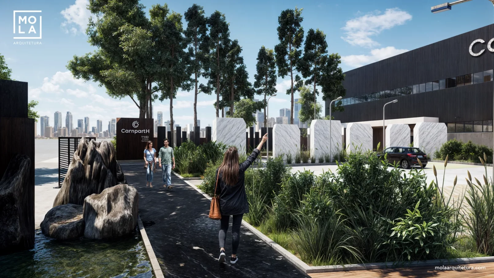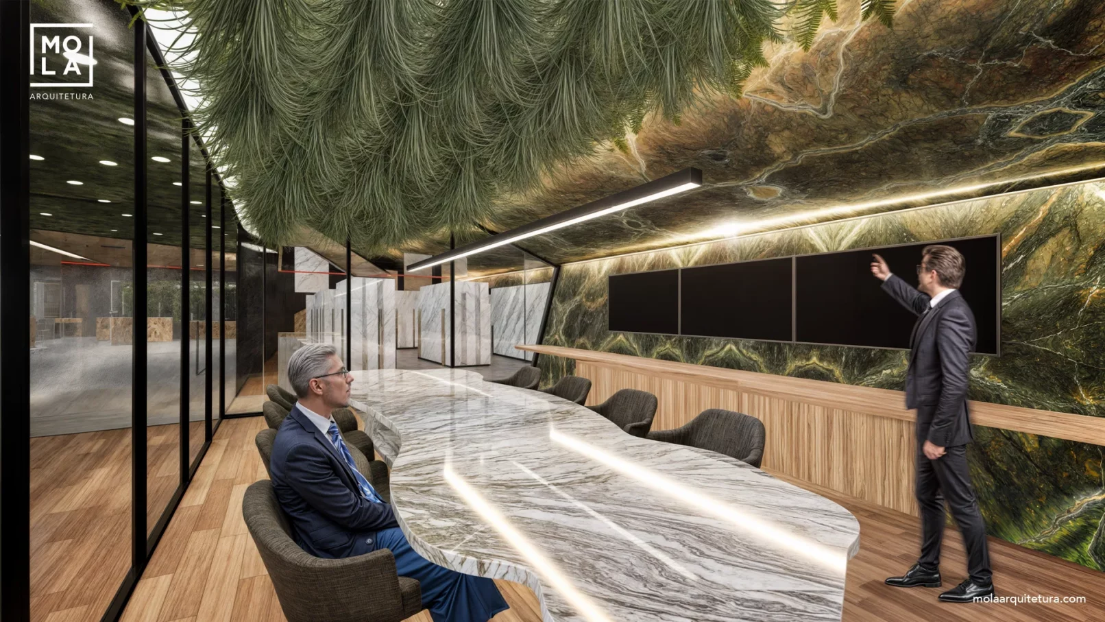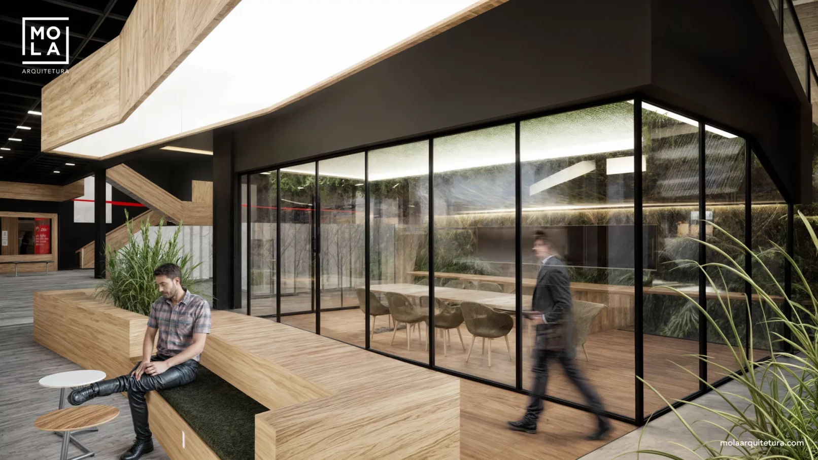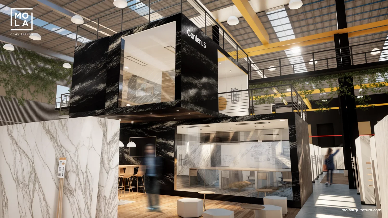 Para trazer maior qualidade a essa experiência, e inovação do hub tanto de quem visita como de quem permanece no local, assim como mais vida a este pavilhão de forte aspecto industrial, nos apoiamos nos pilares do design biofílico. Junto da pedra, criamos combinações com elementos de madeira, maciços de vegetação e espaços com água, oferecendo ao visitante não somente o apelo visual, mas o contato que estimule também seus outros sentidos, como tato e audição. O arranjo entre estes elementos é de grande importância para dar destaque às pedras, junto com a iluminação cênica, trazendo elegância e sofisticação aos espaços. Para entregar ao cliente a possibilidade de visualizar os mais diversos e exóticos tipos de pedra existentes no catálogo do Grupo Qualitá aplicados a uma escala humana e doméstica, estão distribuídos ao longo do terreno pequenos blocos com usos diversos, como espaços gourmet e áreas de lazer. Enquanto o primeiro pavimento se dedica mais à questão visual e comercial das rochas naturais, o segundo pavimento possui um caráter mais voltado aos processos criativos e de networking funcionando com HUB de insumos para arquitetos e designers além de espaço de inovação ligada a estas atividades. Ligado à loja através de uma grande arquibancada, o pavimento funciona como um grande HUB, oferecendo espaços compartilhados de trabalho e de intercambio de conhecimentos principalmente para arquitetos e designers, que terão acesso aos mais diversos conteúdos para composição de moodboards, por exemplo. O conceito aberto e compartilhado deste espaço busca principalmente estimular trocas criativas entre seus usuários, bem como a possibilidade de criação de novos contatos e parcerias comerciais.