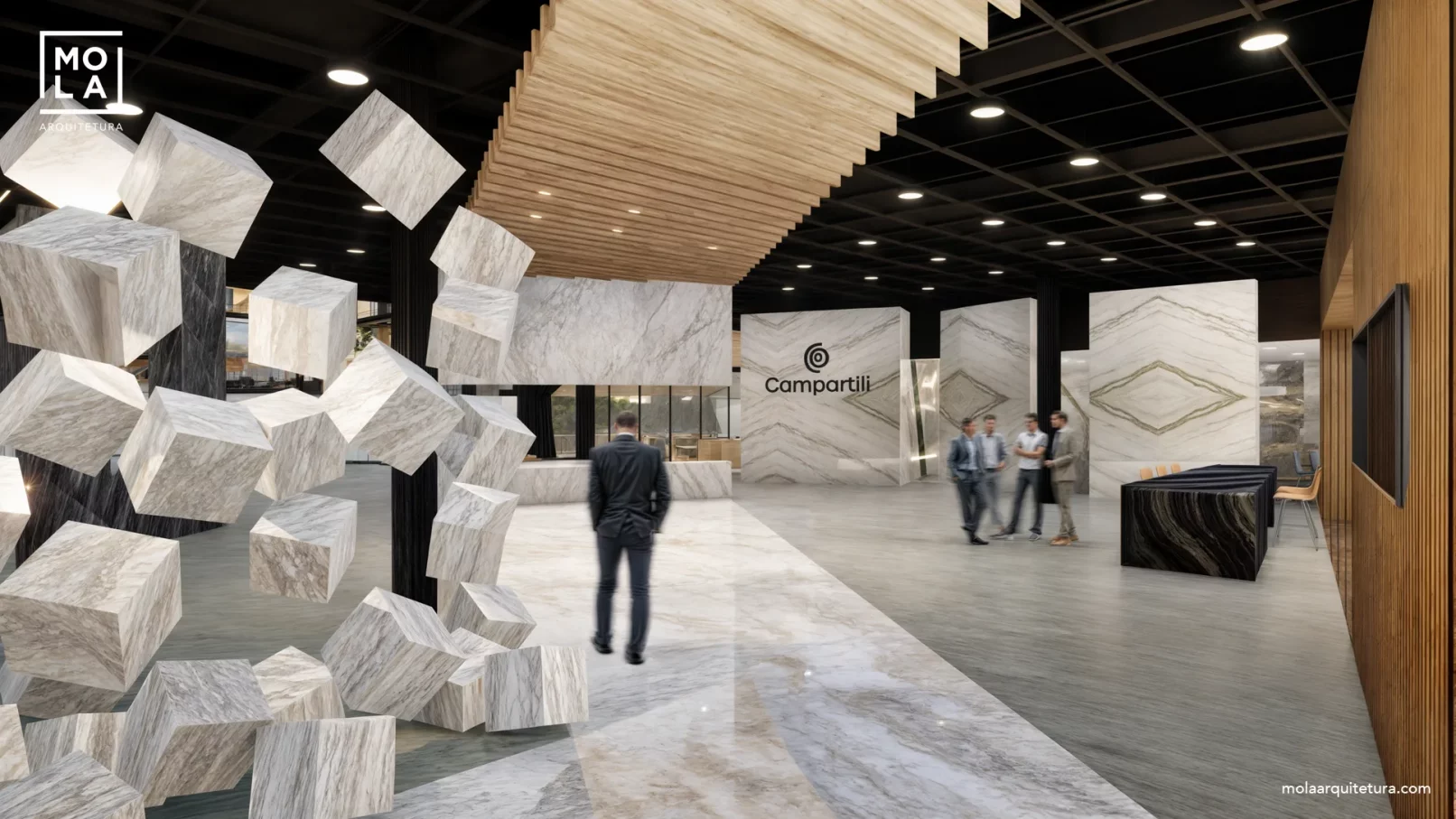 Projeto QUALITASUL HUB COMPARTILI , cria um espaço inovador e um Showroom de revestimentos de pedras naturais e espaço de desenvolvimento criativo inovador em Porto Alegre, este projeto foi um dos maiores desafios para a MOLAARQUITETURA, devido à ampla gama de opções de materiais nobres disponível para aplicação. Para refletir no espaço todo o ciclo da pedra, desde o início de sua formação na natureza até o acabamento da chapa disponível no meio comercial, criamos jogos de alternâncias entre acabamentos, do rústico ao polido, assim como trouxemos pequenas nuances de espaços já associados diretamente com as rochas para o local. Este conceito está presente não só no interior do pavilhão, mas se estende também para as áreas externas, fazendo com que o visitante perceba-o e seja conduzido no espaço através dos elementos arquitetônicos e paisagísticos, experimentando-o das mais diversas formas.