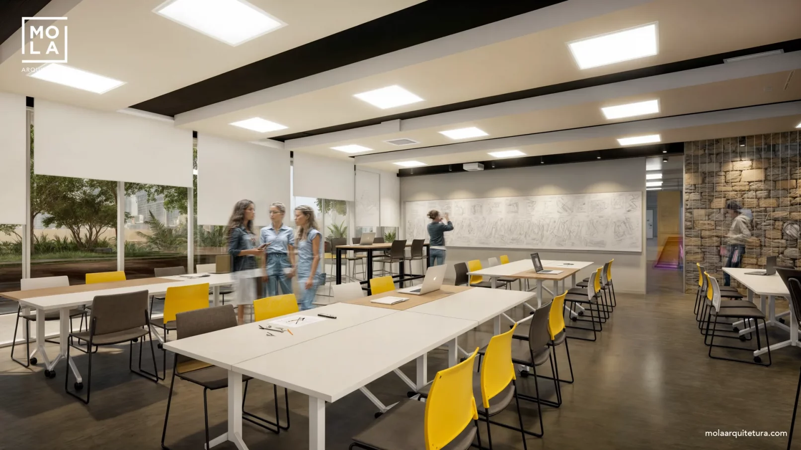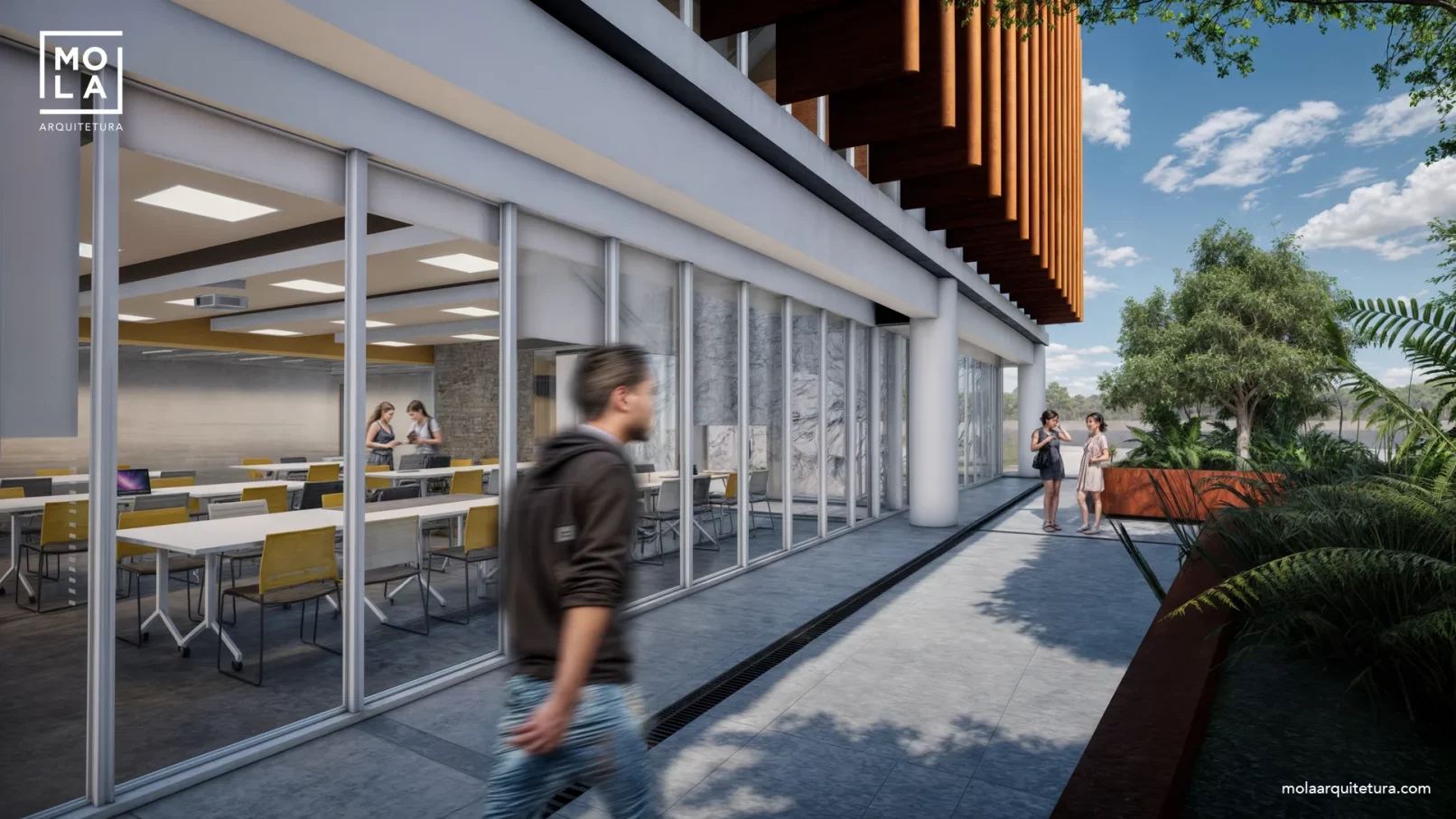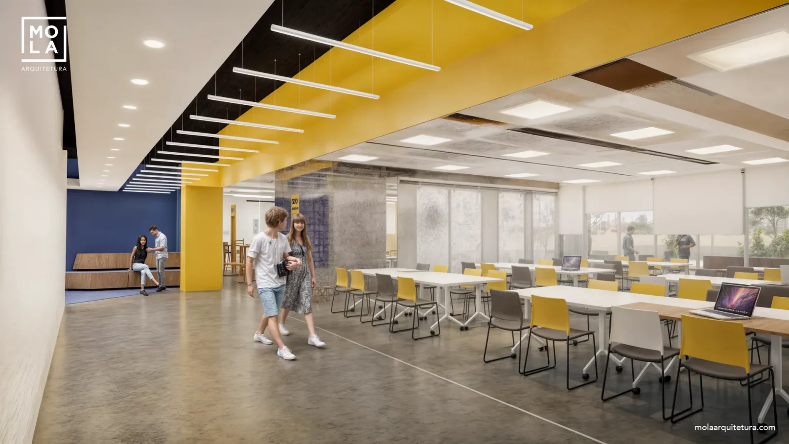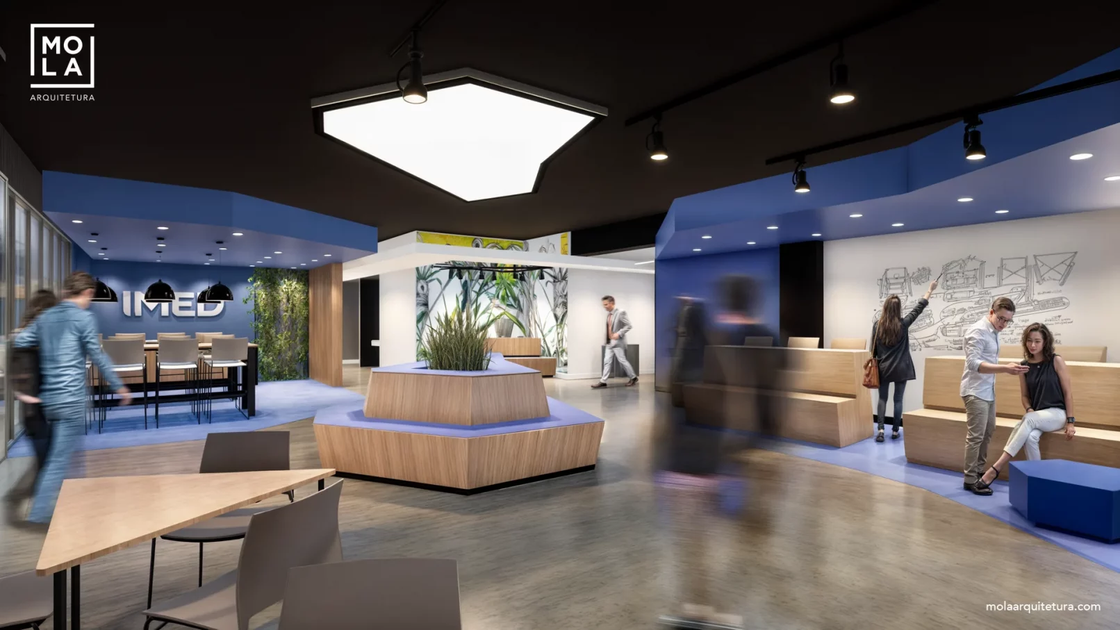 Em novo projeto de arquitetura educacional, novamente em parceria com a IMED, desta vez em um dos novos empreendimentos da Goldzstein Cyrela em Porto Alegre. O principal desafio da Mola Arquitetura para esta sede da universidade foi como trazer a linguagem disruptiva das demais sedes, bem como abrigar todo o programa em um edifício de formato alongado, sem que os espaços ficassem monótonos. Para cumpri-lo, buscamos alternar espaços de estar e permanência com espaços de estudo, além de criar jogos entre superfícies opacas e translúcidas, o que contribui na concepção de um espaço mais aconchegante e adaptado à escala humana.