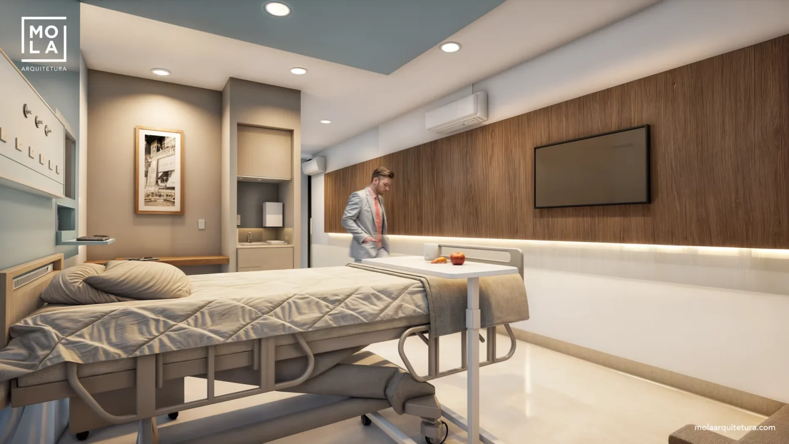 O ambiente ganhou melhores quartos de internação e um posto centralizado de enfermagem novo, todo em harmonia com a nova identidade criada para o hospital, o projeto de interiores busca inspirar sentimentos de bem-estar tanto ao paciente quanto à equipe. Com o uso da madeira e os diferentes tons da areia, azul e cinza proporcionamos harmonia e coerência conceitual com ala de internação.