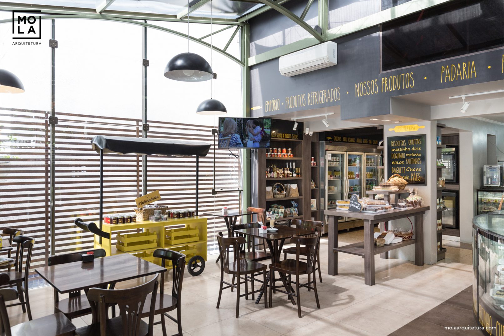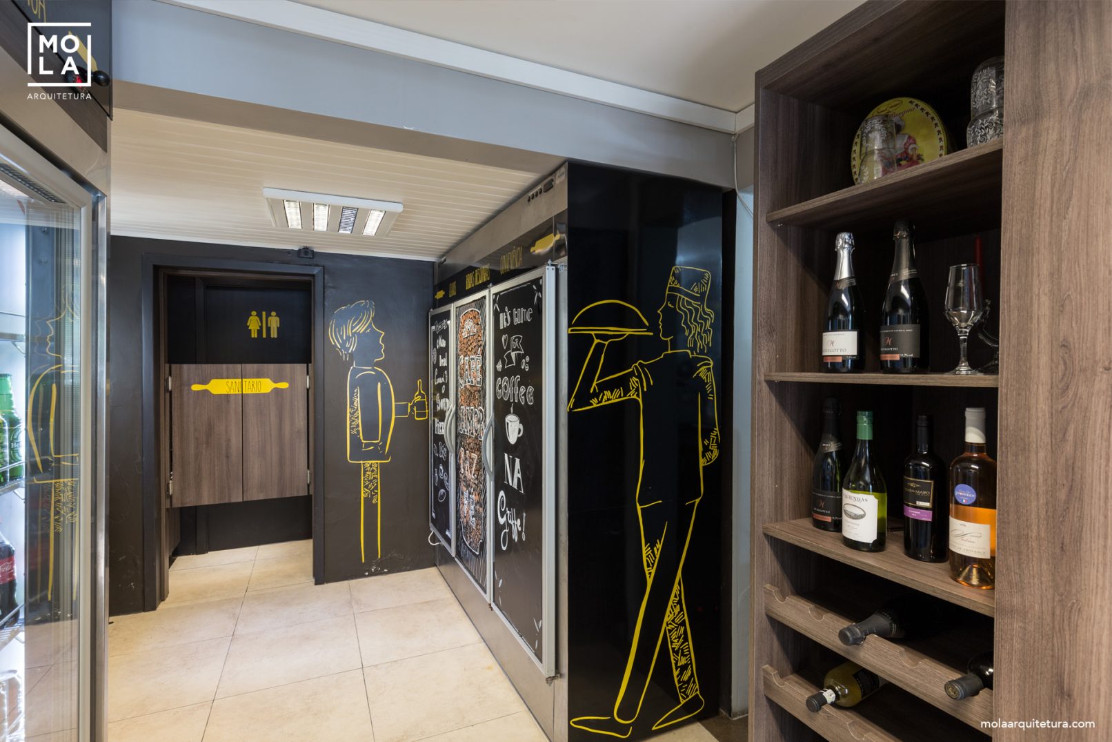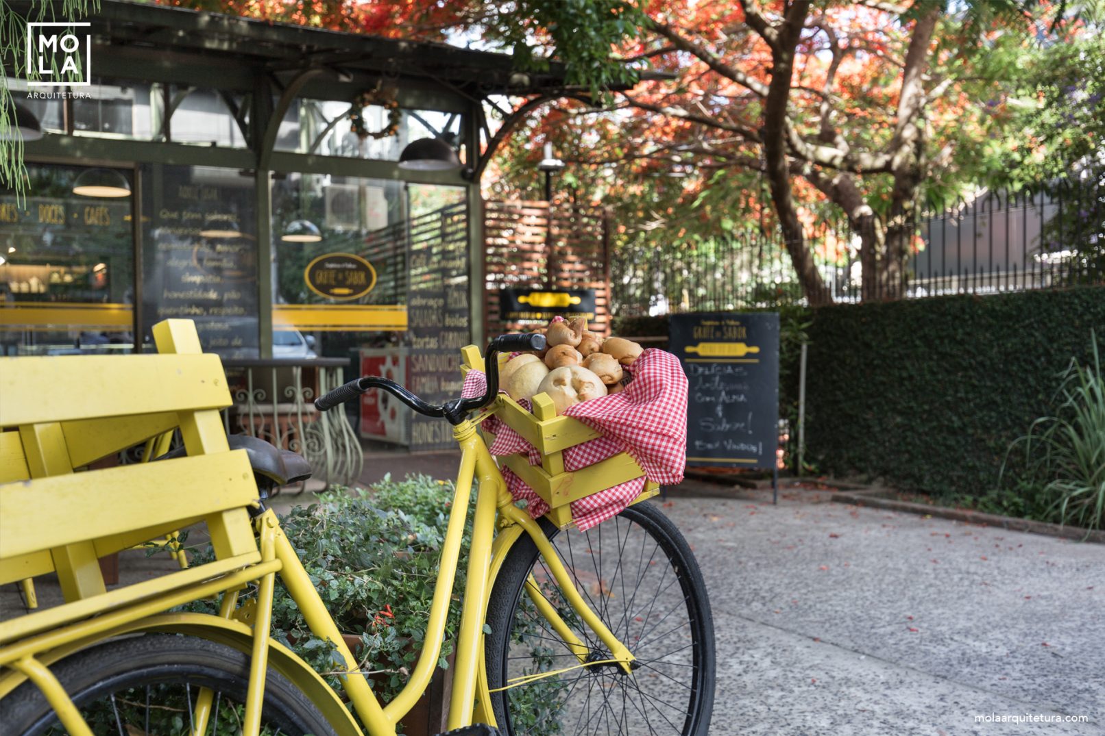 Tanto o projeto de arquitetura de interiores como os elementos de comunicação, ao mesmo tempo em que conversam com a área externa, criam um contraste que proporciona um caráter mais interessante ao espaço. A presença de cores e texturas mais sóbrias junto de cores mais vivas, como o amarelo, cria um contraste que permite ao ambiente um caráter elegante enquanto também o torna divertido e descolado.